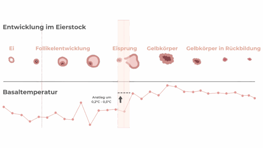 Der Zervixschleim wird klar und spinnbar („fadenziehend“), und nach dem Eisprung steigt die Basaltemperatur typischerweise um 0,2–0,5 °C an – ein verlässliches Zeichen, dass der Eisprung stattgefunden hat.